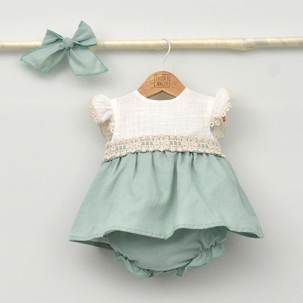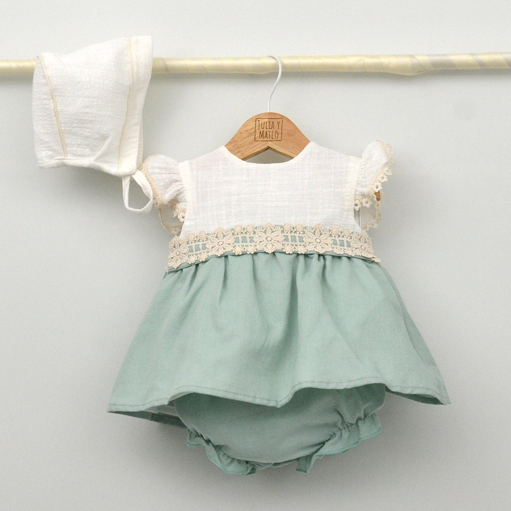 Composición: tela color verde agua: 55% lino, 45% algodón Tela: Blanco roto100% algodón, Forro vestido: 33% algodón, 67%, poliéster. jesusitos niñas