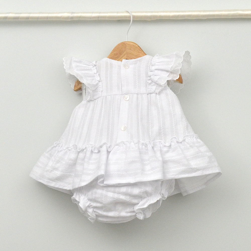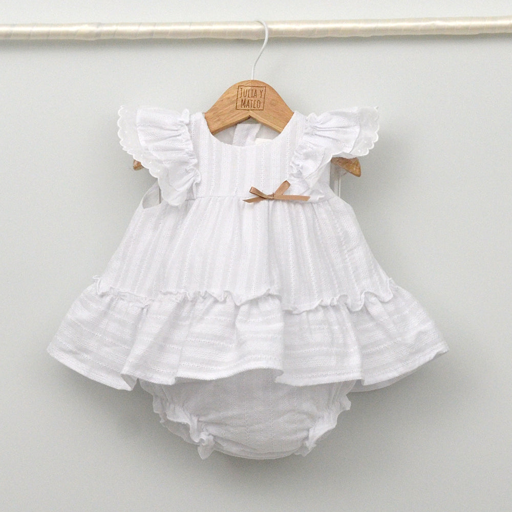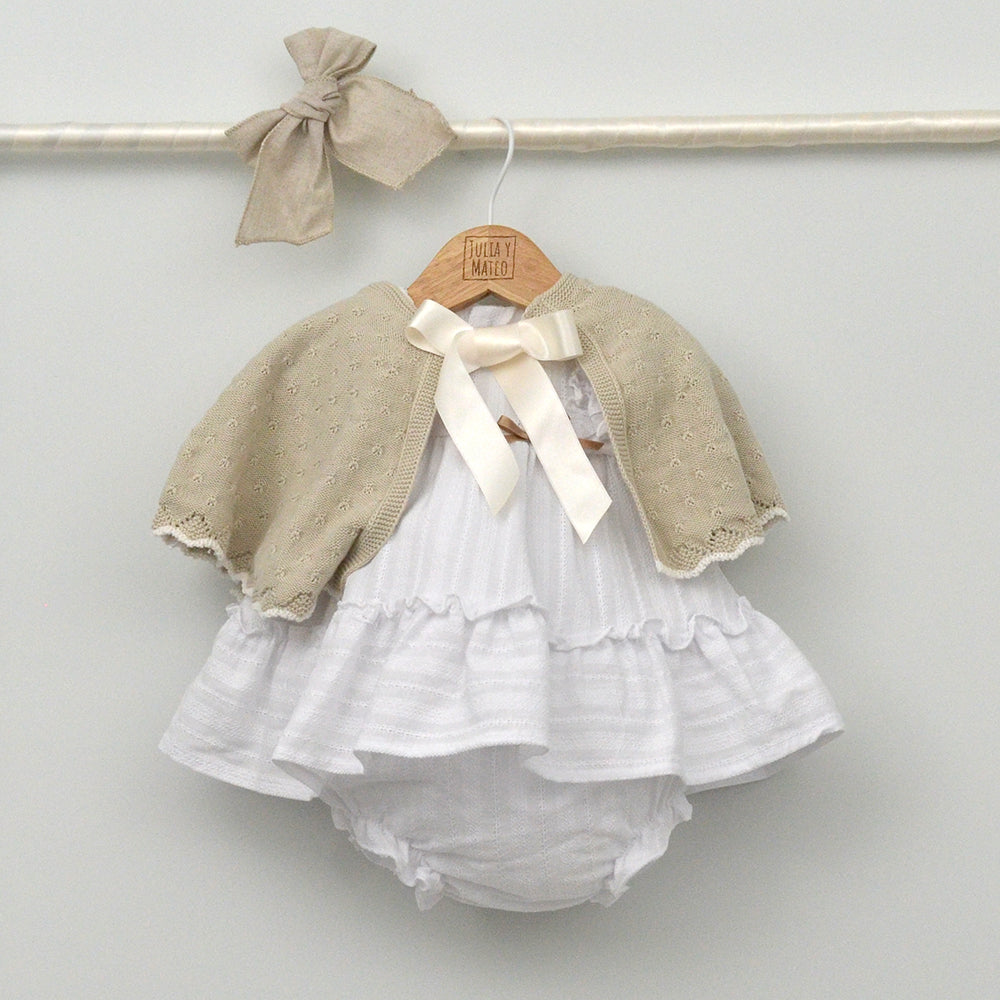 Pertenece a la familia Ibiza con vestido y pelele para herman@s conjuntad@s y lazo a juego y capa a juego (no incluido).