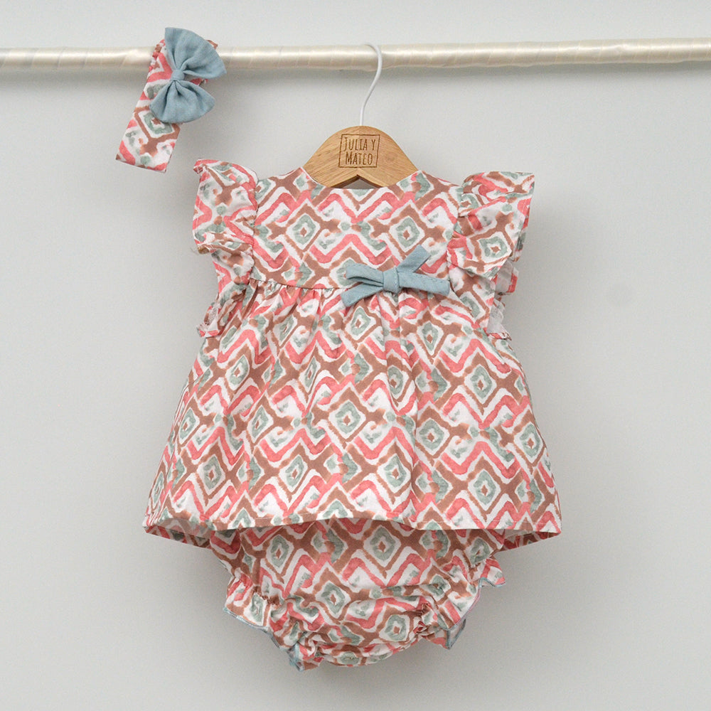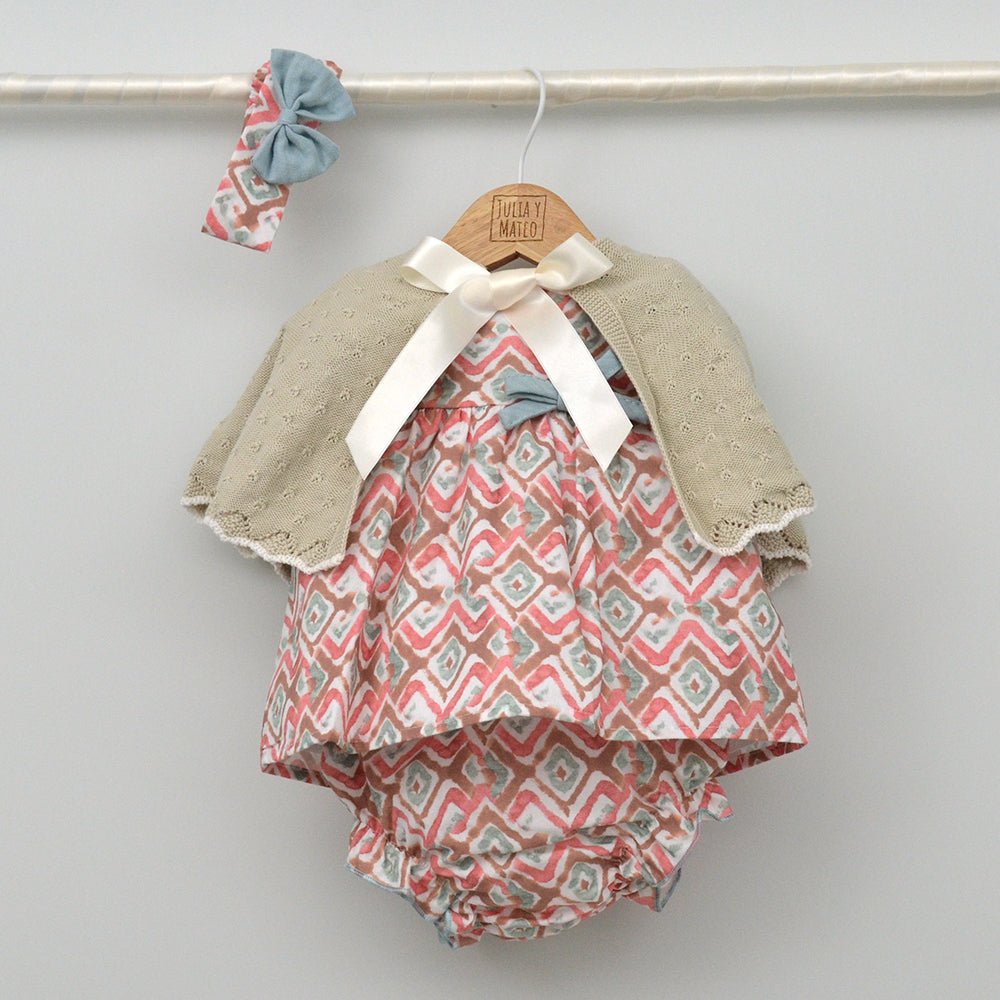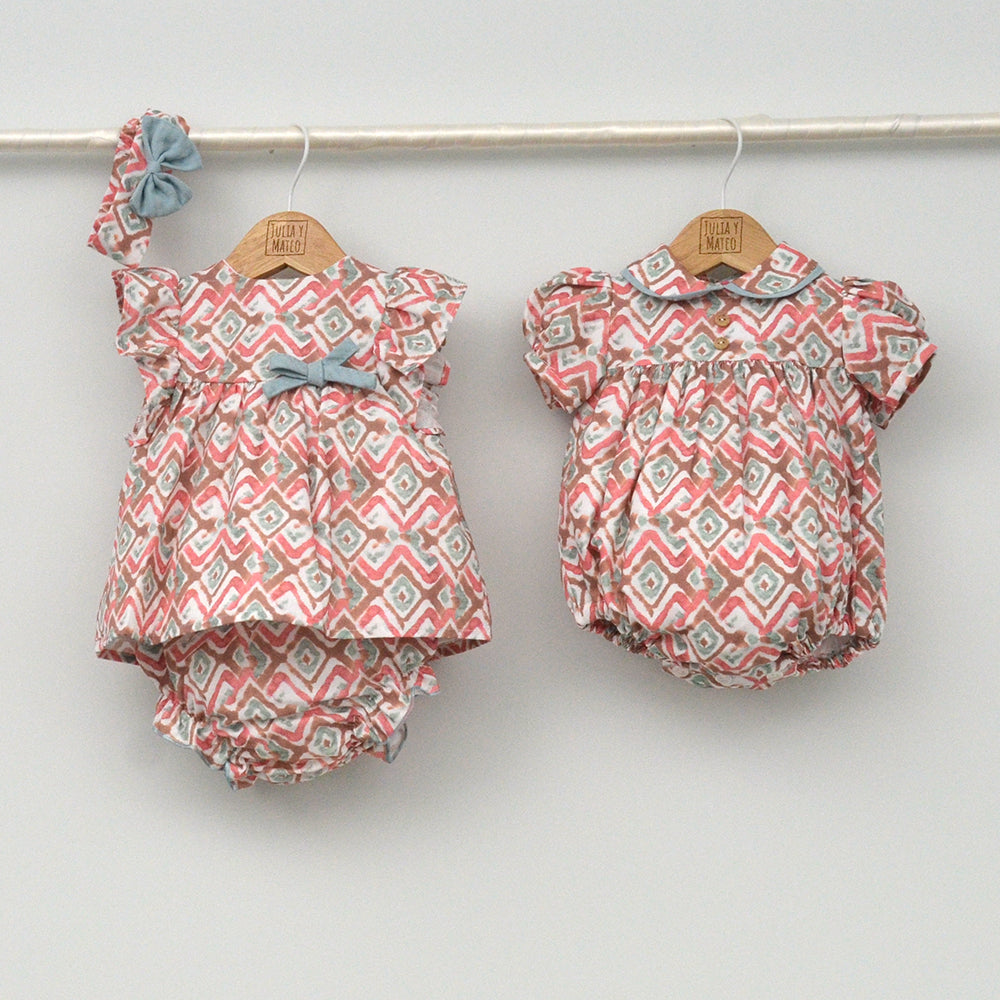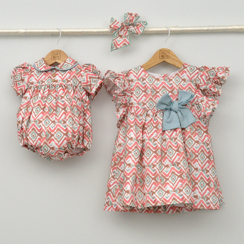 Pertenece a la familia Menorca con vestido y pelele para herman@s conjuntad@s y lazo a juego y capa a juego (no incluido).